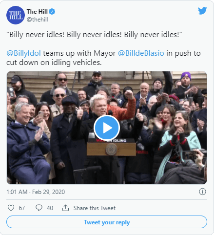 Idol himself stood alongside Mayor Bill de Blasio, who proclaimed that “White Wedding” would be the walk-on music for all future City Hall policy announcements. The then-64-year-old rocker was there to help launch a new public awareness campaign, “Billy Never Idles,” aimed at reminding New Yorkers to turn off their engines when not in use. “Shut it off!” Idol bellowed, in his signature style.